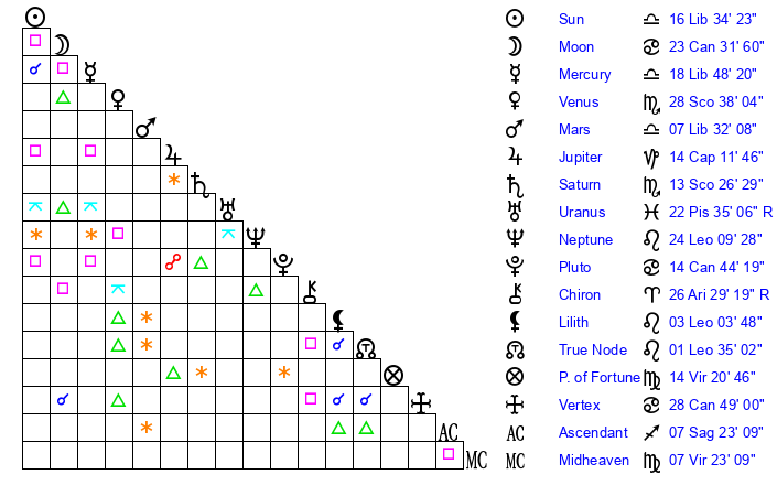 | Saturn | 13 Scorpio 56 | 26 Pisces 57 | 24 Scorpio 44 |