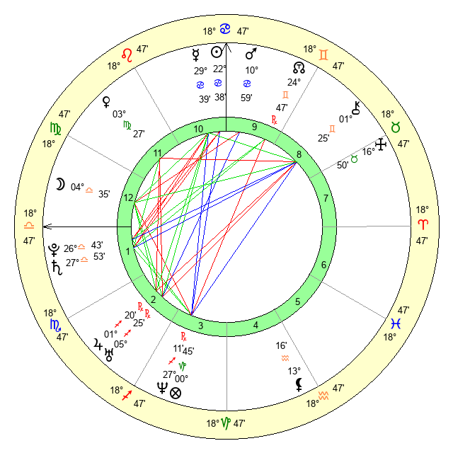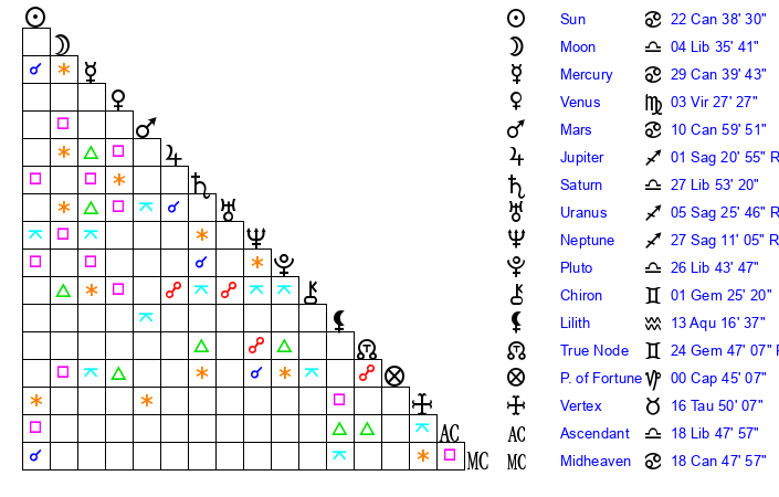 | Venus | 3 Virgo 27 | 12 Gemini 20 | 0 Virgo 29 |