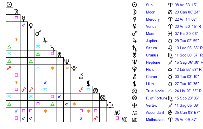 | Sun | 8 Aries 53 | 9 Aries 15 | 25 Taurus 42 |