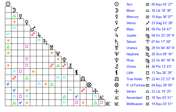 | Saturn | 7 Aries 29 | 16 Pisces 17 | 13 Aries 22 |