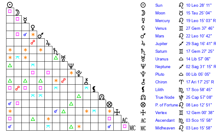 Sun | 10 Leo 28 | 10 Leo 39 | 1 Libra 44 |
