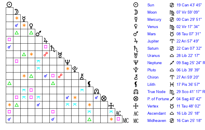 | Moon | 7 Virgo 58 | 12 Aquarius 59 | 28 Gemini 25 |