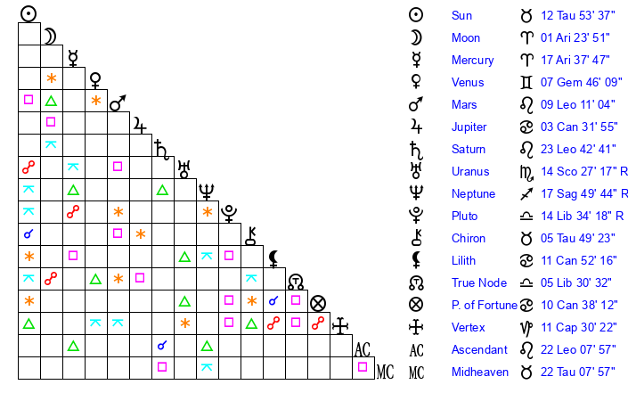 | Sun | 12 Taurus 54 | 13 Taurus 30 | 28 Gemini 3 |