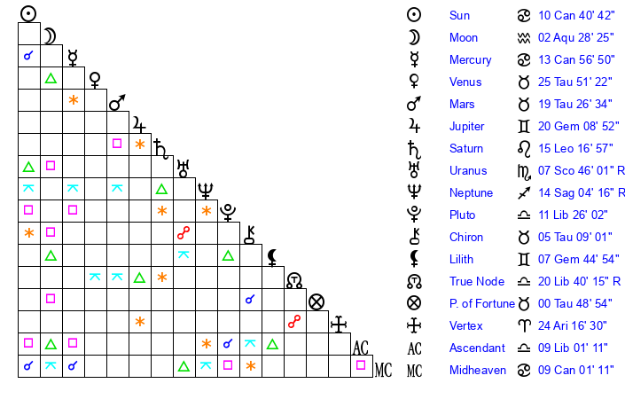 | Moon | 2 Aquarius 28 | 9 Libra 59 | 26 Libra 12 |