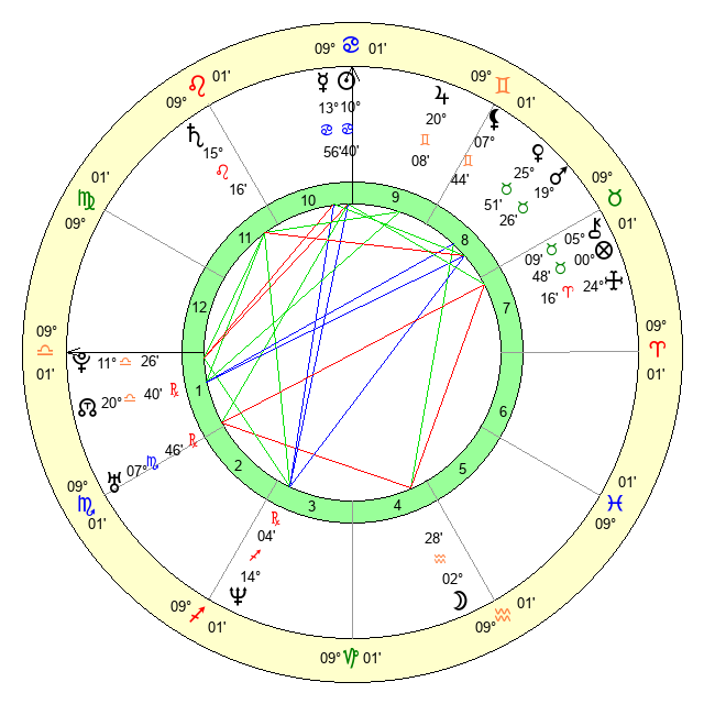 | Mercury | 13 Cancer 57 | 6 Leo 56 | 20 Virgo 23 |