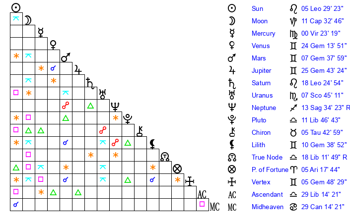 | Sun | 5 Leo 29 | 5 Leo 52 | 21 Virgo 45 |