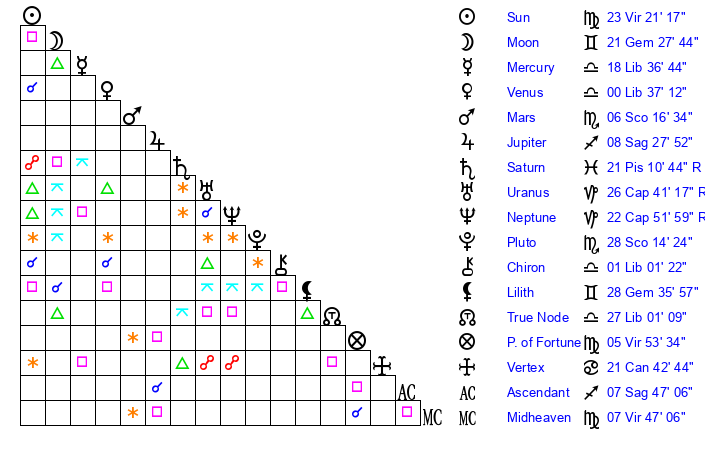 | Sun | 23 Virgo 21 | 24 Virgo 5 | 22 Libra 51 |