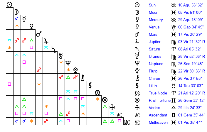 | Sun | 10 Aquarius 53 | 12 Aquarius 4 | 8 Aries 5 |