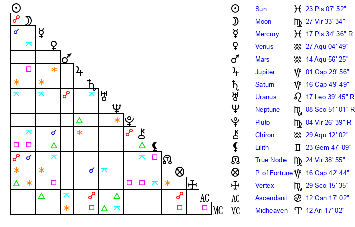 | Moon | 27 Virgo 37 | 16 Virgo 46 | 25 Aquarius 14 |