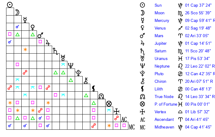 | Saturn | 11 Scorpio 52 | 25 Pisces 39 | 13 Scorpio 35 |