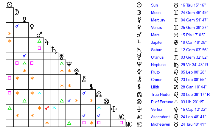 | Moon | 24 Gemini 45 | 22 Virgo 58 | 26 Gemini 55 |