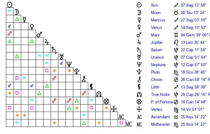| Moon | 0 Taurus 17 | 25 Pisces 25 | 22 Leo 53 |