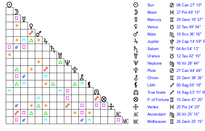 | Moon | 27 Pisces 42 | 15 Virgo 36 | 26 Gemini 4 |