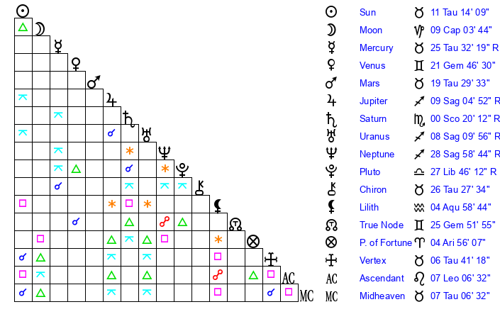 | Sun | 11 Taurus 14 | 12 Taurus 3 | 21 Gemini 38 |