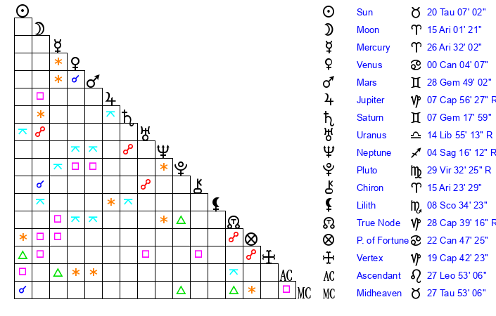 | Sun | 20 Taurus 7 | 20 Taurus 17 | 10 Cancer 52 |