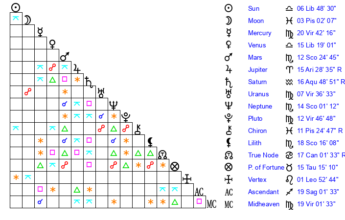 | Pluto | 12 Virgo 47 | 1 Aquarius 24 | 14 Virgo 10 |