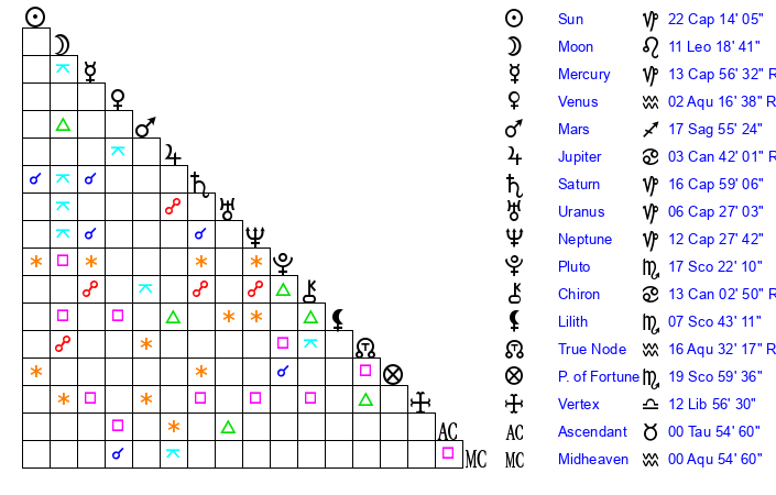 | Mercury | 13 Capricorn 56 | 6 Capricorn 11 | 6 Aquarius 30 |