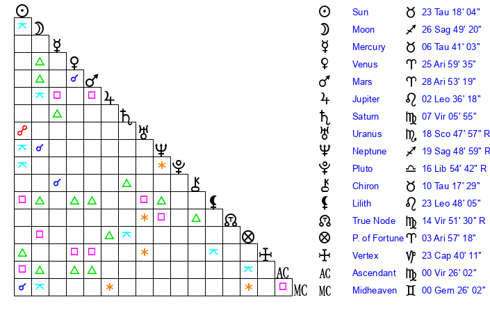 | Sun | 23 Taurus 18 | 24 Taurus 9 | 7 Cancer 21 |