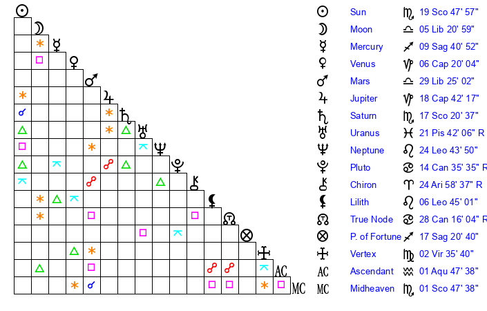 | Saturn | 17 Scorpio 49 | 25 Pisces 16 | 26 Scorpio 24 |