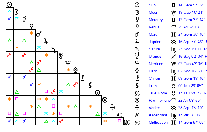 | Jupiter | 16 Aquarius 56 | 29 Gemini 4 | 14 Aquarius 27 |