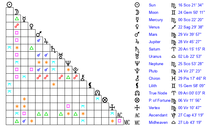 | Sun | 16 Scorpio 22 | 16 Scorpio 32 | 14 Capricorn 11 |