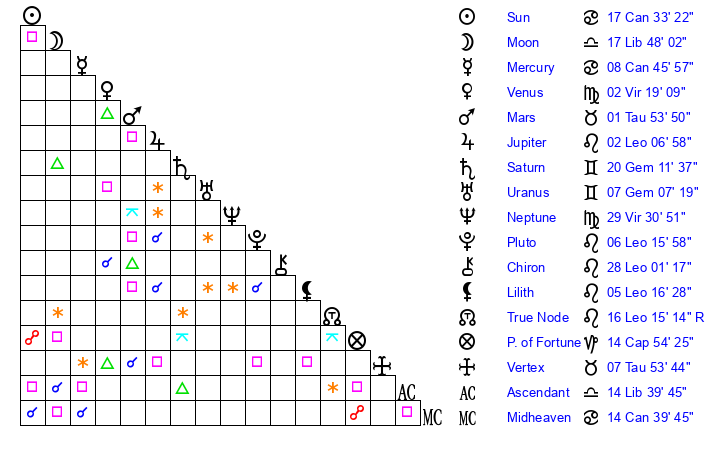 | Moon | 17 Libra 39 | 16 Capricorn 59 | 21 Libra 1 |