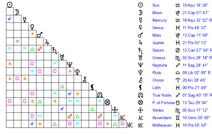 | Sun | 19 Aquarius 18 | 20 Aquarius 11 | 9 Aries 22 |