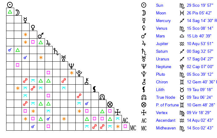 | Moon | 26 Pisces 11 | 15 Sagittarius 11 | 1 Virgo 12 |