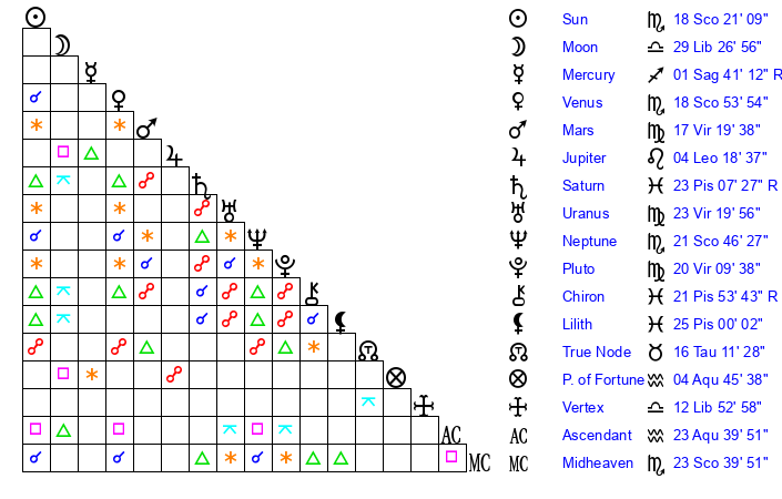 Neptune | 21 Scorpio 47 | 27 Pisces 19 | 23 Scorpio 44 |