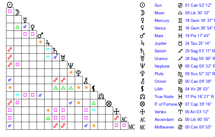 | Moon | 9 Libra 23 | 0 Gemini 2 | 20 Aquarius 51 |