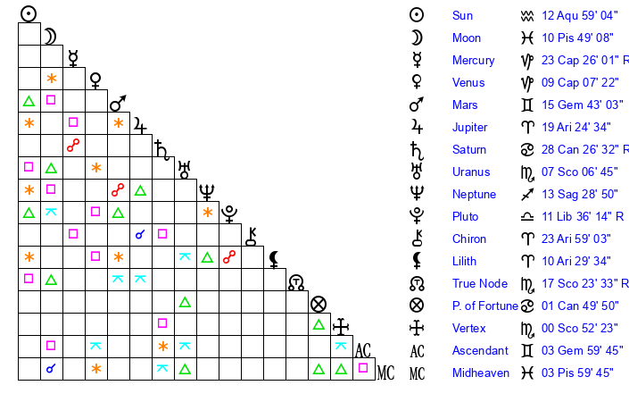 | Sun | 12 Aquarius 59 | 14 Aquarius 6 | 2 Aries 12 |