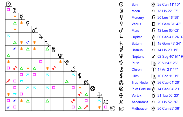 | Moon | 18 Libra 31 | 21 Aries 6 | 27 Virgo 31 |