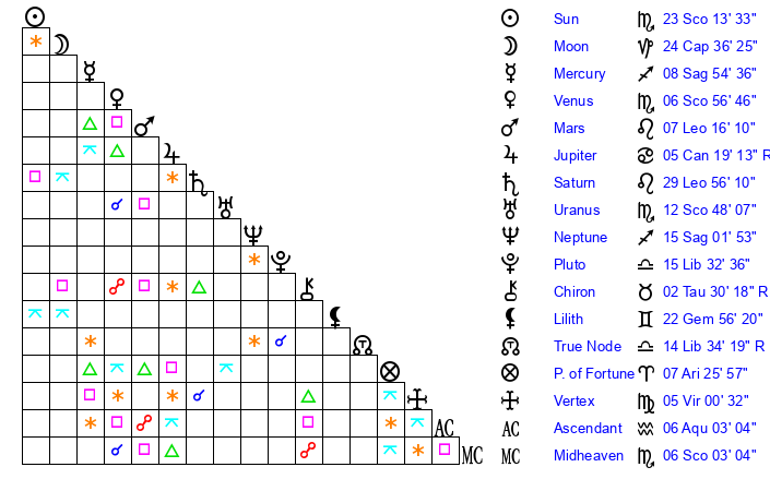 | Venus | 6 Scorpio 57 | 10 Scorpio 59 | 7 Capricorn 17 |