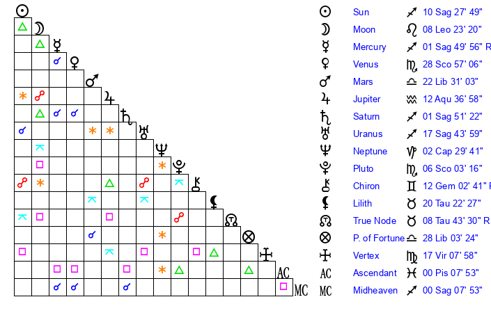 | Moon | 8 Leo 21 | 27 Sagittarius 50 | 22 Capricorn 50 |