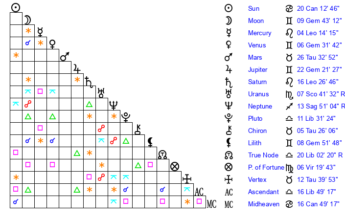 | Venus | 6 Gemini 32 | 8 Gemini 58 | 1 Leo 16 |