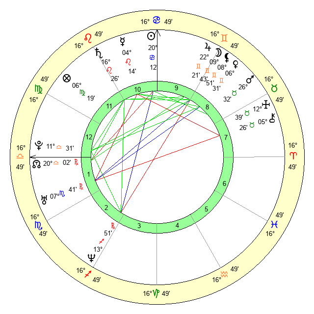 | Sun | 20 Cancer 13 | 20 Cancer 36 | 6 Virgo 13 |