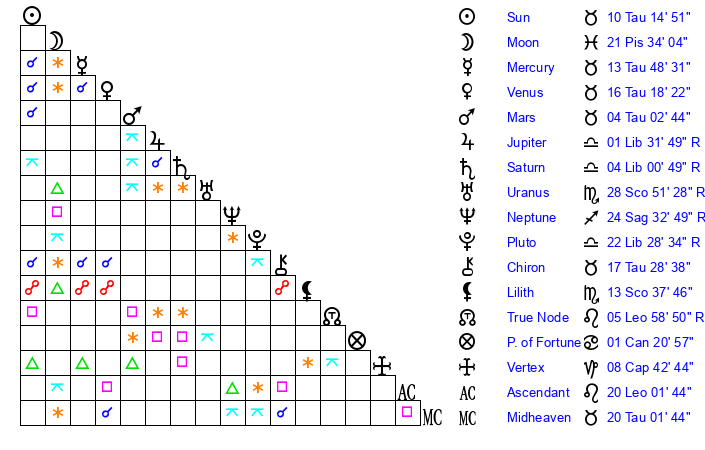 | Uranus | 28 Scorpio 55 | 26 Taurus 19 | 27 Scorpio 8 |