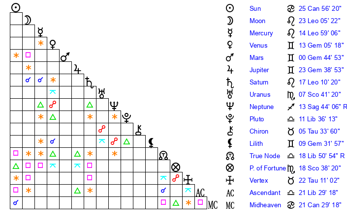 | Moon | 23 Leo 13 | 5 Taurus 14 | 2 Gemini 17 |