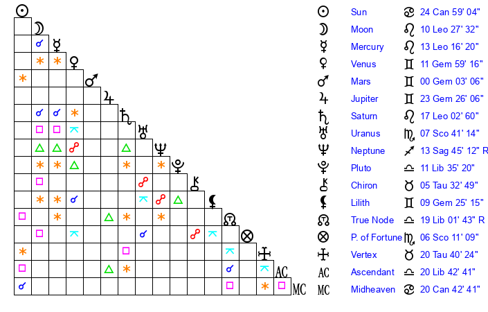 | Venus | 11 Gemini 59 | 14 Gemini 36 | 7 Leo 13 |