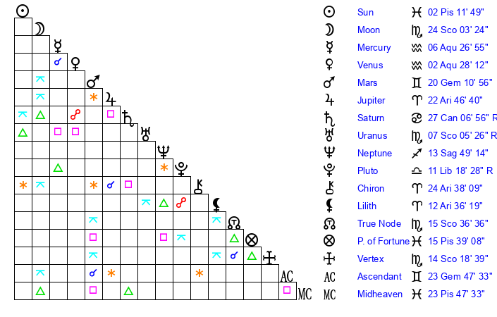| Moon | 23 Scorpio 57 | 14 Sagittarius 3 | 28 Leo 5 |