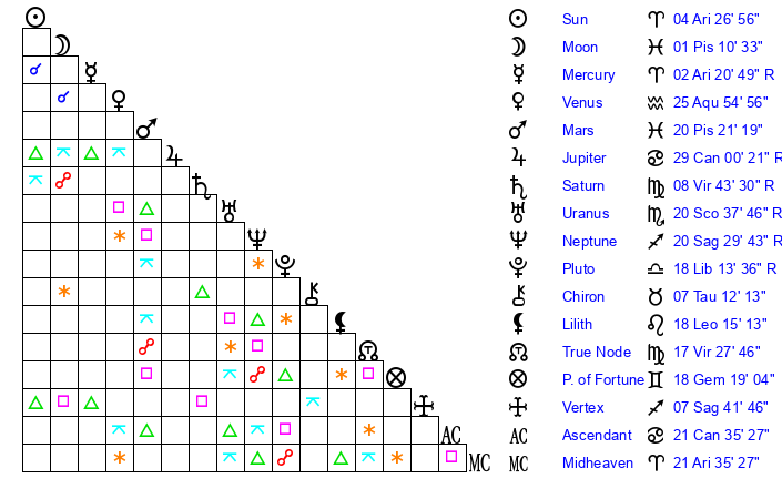 | Venus | 25 Aquarius 55 | 1 Aries 1 | 21 Aries 10 |