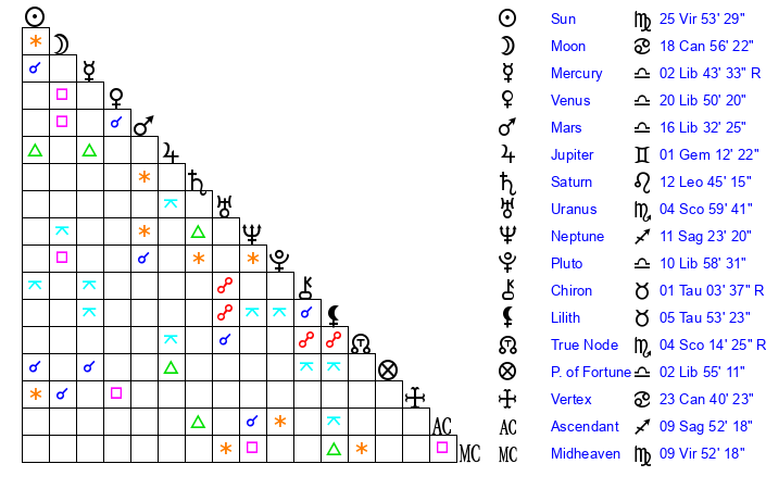 | Sun | 25 Virgo 53 | 26 Virgo 2 | 14 Scorpio 25 |