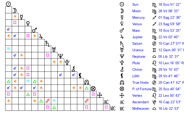 | Sun | 18 Scorpio 52 | 19 Scorpio 13 | 11 Aquarius 9 |