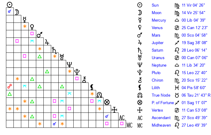 | Sun | 11 Virgo 5 | 11 Virgo 27 | 27 Scorpio 17 |