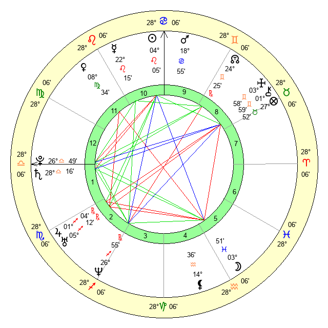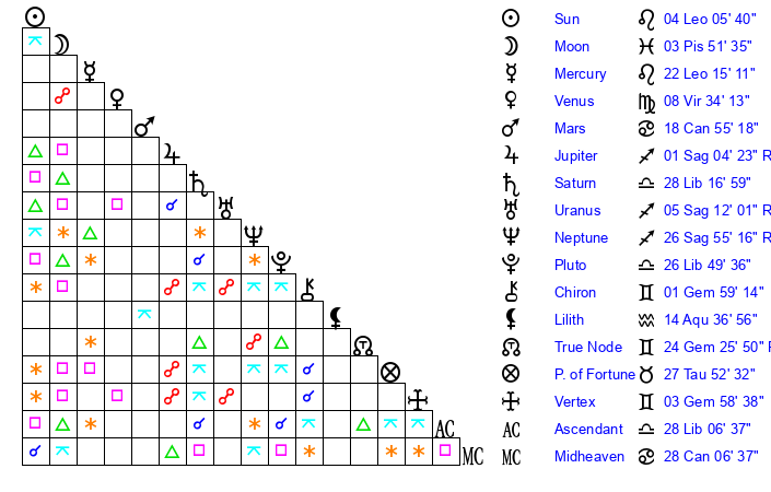 | Mars | 18 Cancer 56 | 23 Virgo 40 | 16 Leo 0 |