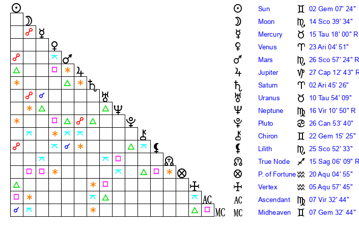 | Sun | 2 Gemini 7 | 2 Gemini 49 | 26 Leo 16 |