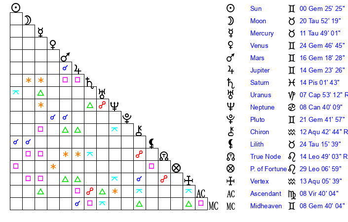 Sun | 0 Gemini 26 | 1 Gemini 37 | 24 Virgo 37 |