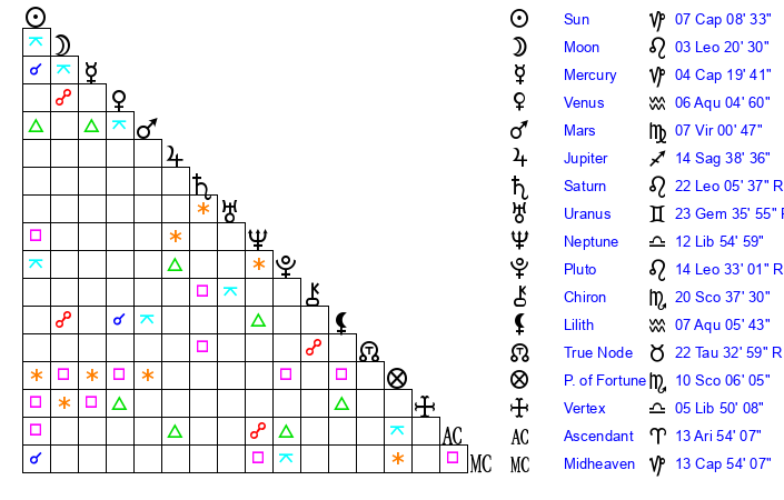 | Pluto | 14 Leo 32 | 0 Aquarius 59 | 12 Leo 53 |