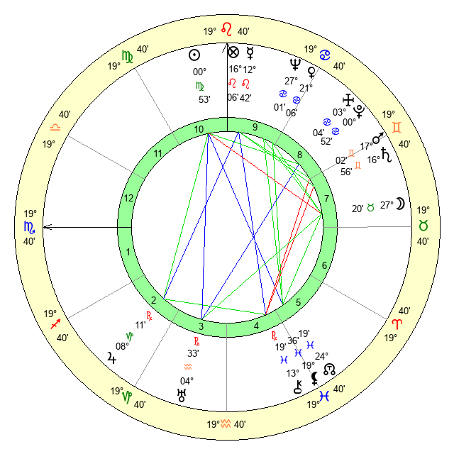 | Moon | 27 Taurus 10 | 18 Virgo 54 | 5 Cancer 26 |