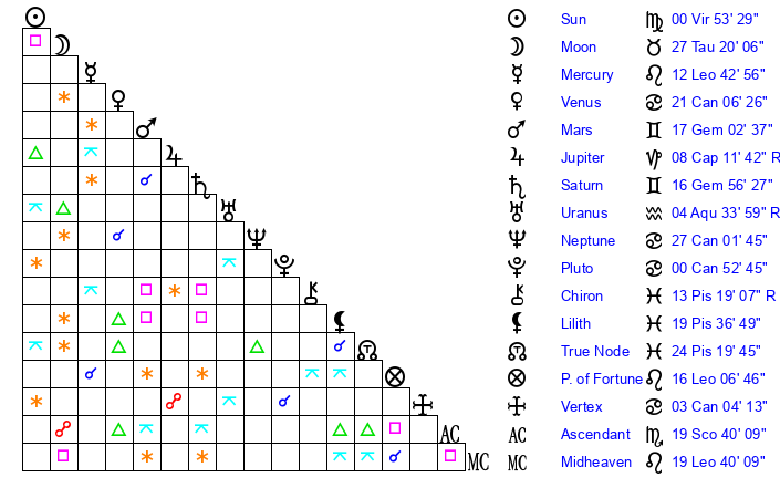 | Moon | 27 Taurus 10 | 18 Virgo 54 | 5 Cancer 26 |